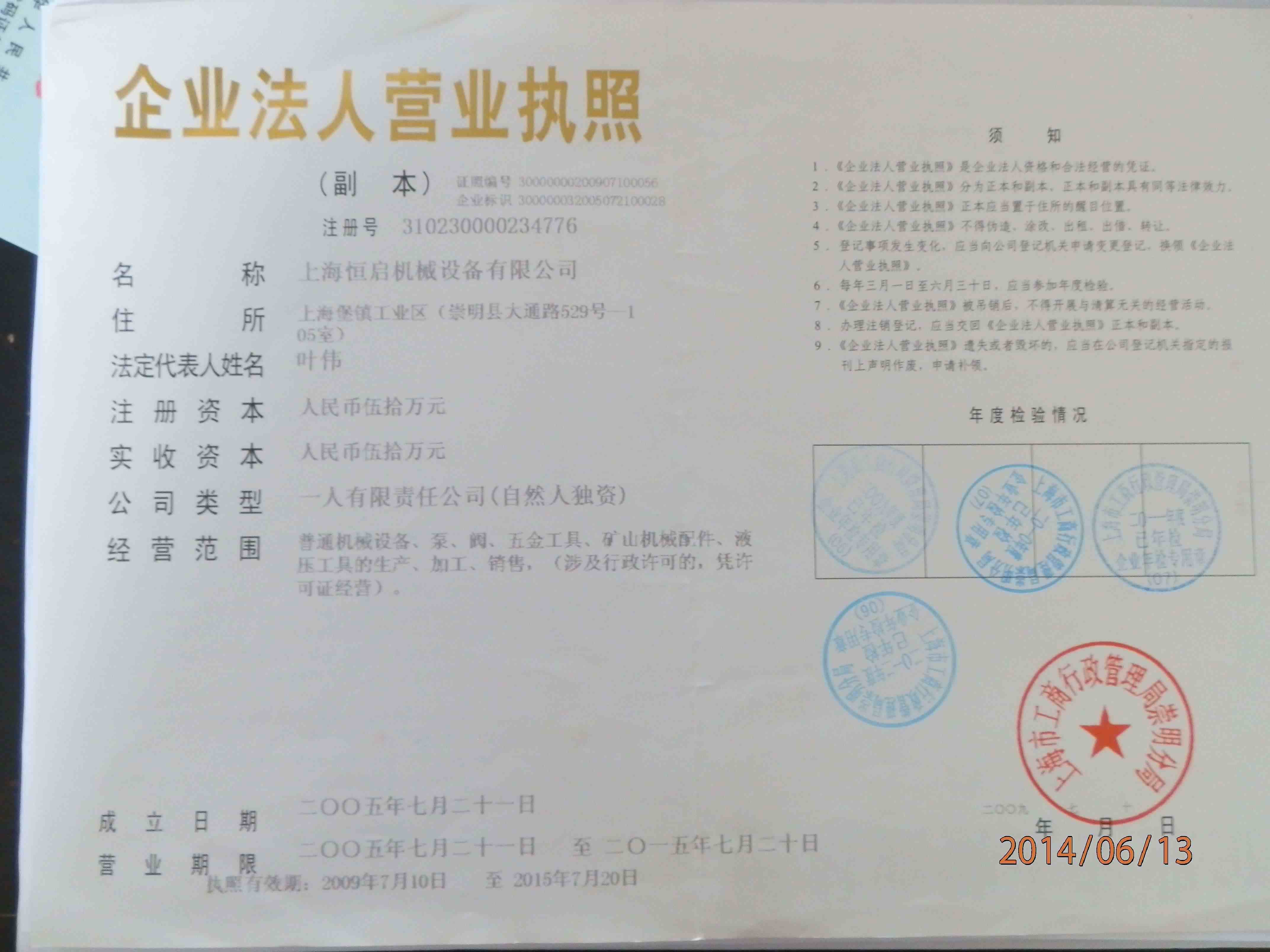 About us上海恒啟機械有限公司注冊成立于2000年,至今已有15年之久。期間不斷生產(chǎn)制造且經(jīng)營供應手動試壓泵、電動打壓泵、電動試壓泵、彎管機(手動和電動)、液壓沖孔(手動和電動)、切斷、彎排機、超高壓油泵(手動和電動)以及礦山機、千斤頂、沖孔機、咬口機等,是一家中國大陸企業(yè)。